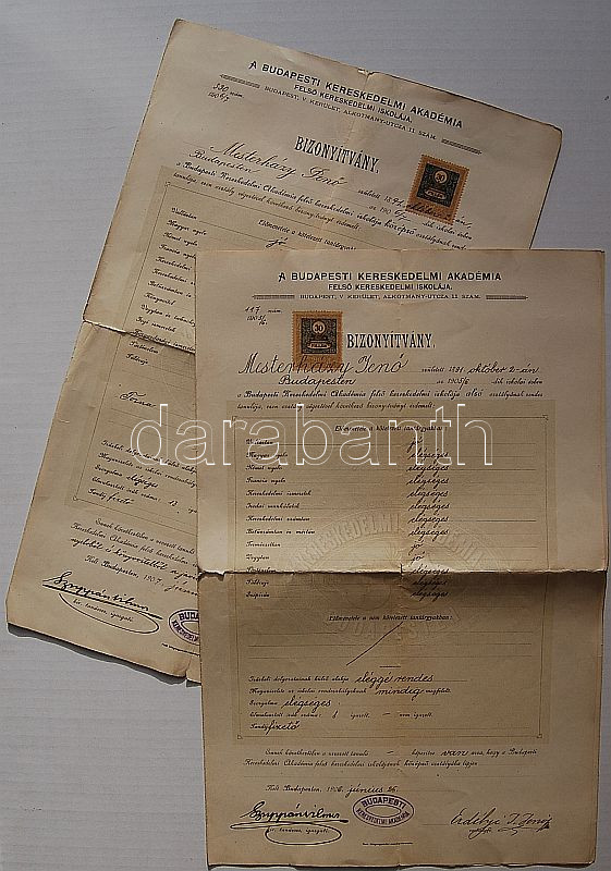 A Bpesti Kereskedelmi Akadémia 2db bizonyítványa (1906, 1907) okmánybé... https://www.darabanth.com/hu/39-Gyorsarveres/39.0/Festmeny-mutargy-papirregiseg-egyeb/Okmanyok~212/A-Bpesti-Kereskedelmi-Akademia-2db-bizonyitvanya-1906-1907-okmanybelyeggel~II71870