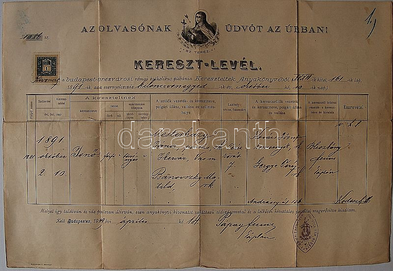 Leírás: Díszes keresztlevél okmánybélyeggel (1909) Bp. terézvárosi rom.kat. plébánia