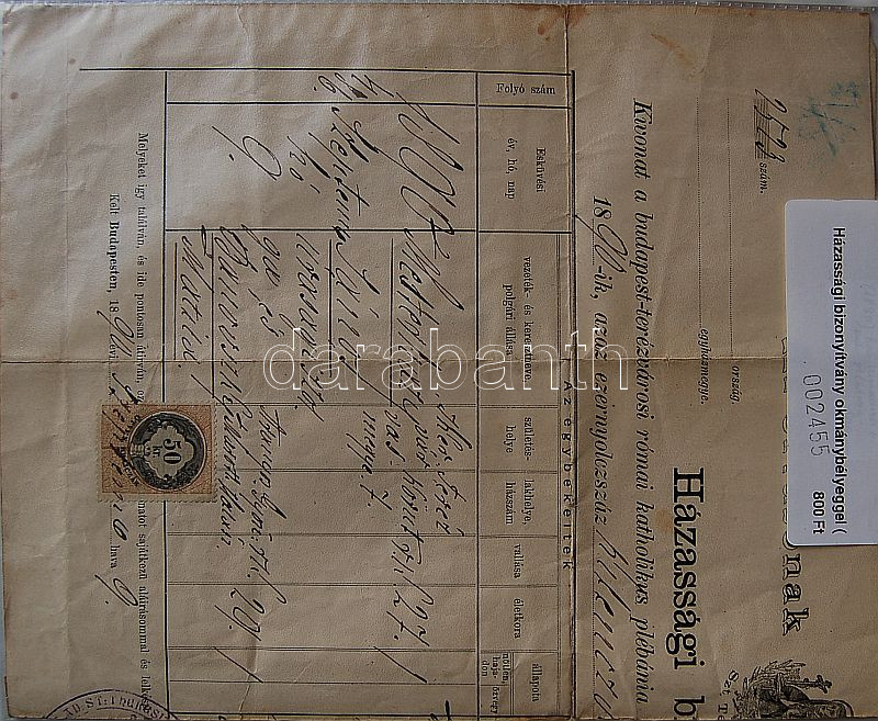 Házassági bizonyítvány okmánybélyeggel (1890)Bp. terézvárosi rom.kat. ... https://www.darabanth.com/hu/39-Gyorsarveres/39.0/Festmeny-mutargy-papirregiseg-egyeb/Okmanyok~212/Hazassagi-bizonyitvany-okmanybelyeggel-1890Bp-terezvarosi-romkat-plebania~II71874