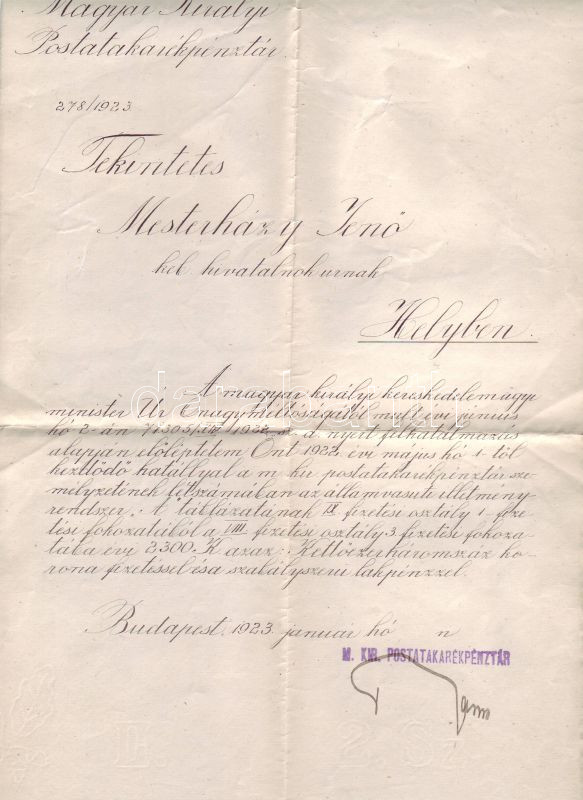 M.Kir. Postatakarékpénztár kinevezési és besorolási okmányai 1910-1936... https://www.darabanth.com/hu/39-Gyorsarveres/39.0/Festmeny-mutargy-papirregiseg-egyeb/Okmanyok~212/MKir-Postatakarekpenztar-kinevezesi-es-besorolasi-okmanyai-1910-1936-ig-7db~II71859