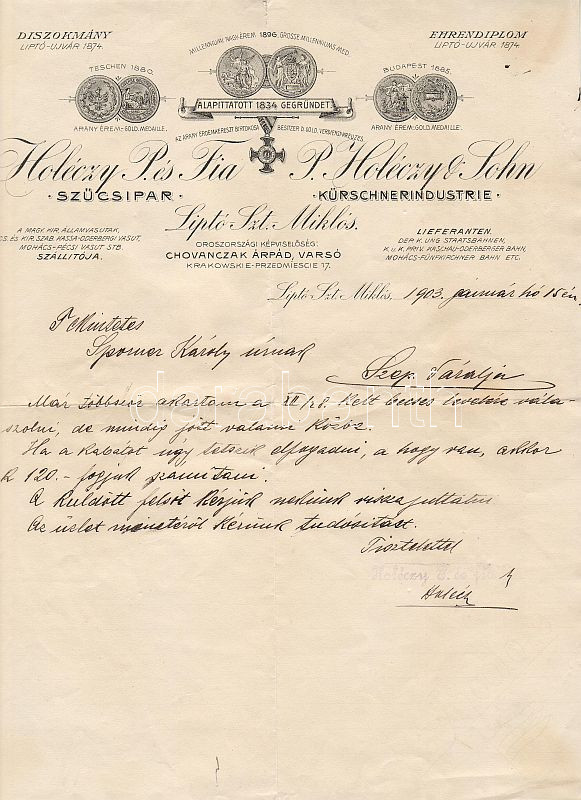 Leírás: 1903 Haléczy Szűcsipar Liptószentmiklós díszes számla