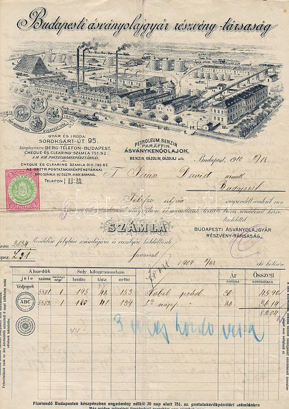 1910 Ásványolaj Rt. Bp. díszes számla https://www.darabanth.com/hu/39-Gyorsarveres/39.0/Festmeny-mutargy-papirregiseg-egyeb/Szamlak-levelpapirok~214/1910-Asvanyolaj-Rt-Bp-diszes-szamla~II75597