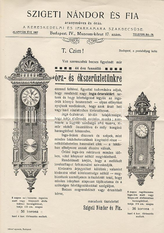 Leírás: 1910 Szigeti Aranyműves és órás reklámnyomtatvány