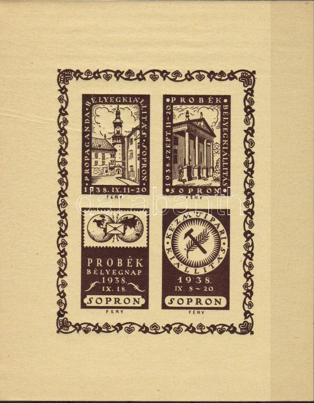 Leírás: 1938 Soproni PROBEK bélyegnap és kiállítás emlékív 6bb (7000)