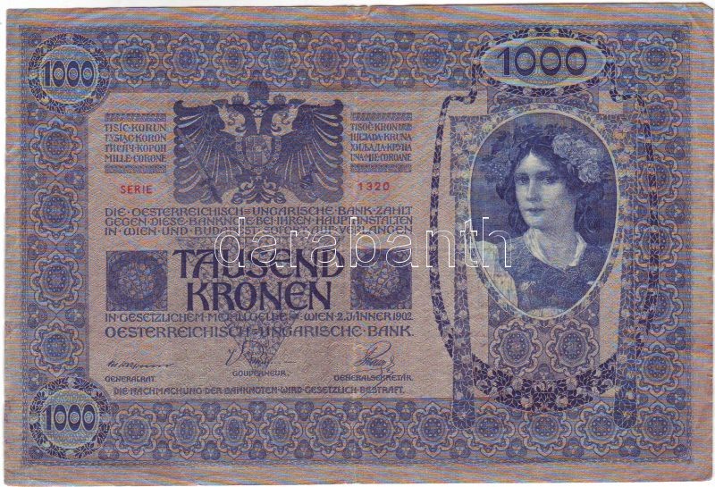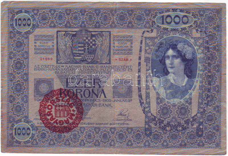 Leírás: 1902. 1000K piros "Magyarország" körbélyegzővel T:II-