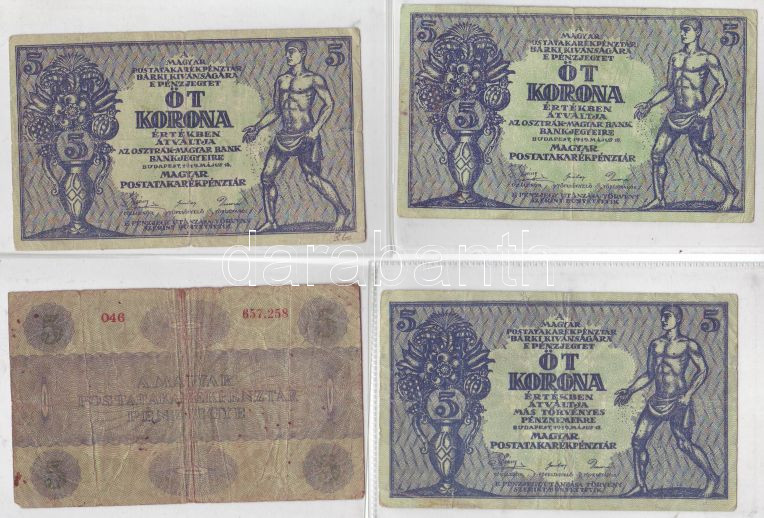 Leírás: 1919. 5K "T.K" 2 klf variáns (2x) ("Osztrák-magyar Bank-más törvényes...") összesen 4 db, színvariánsok T:II/III,III/IV