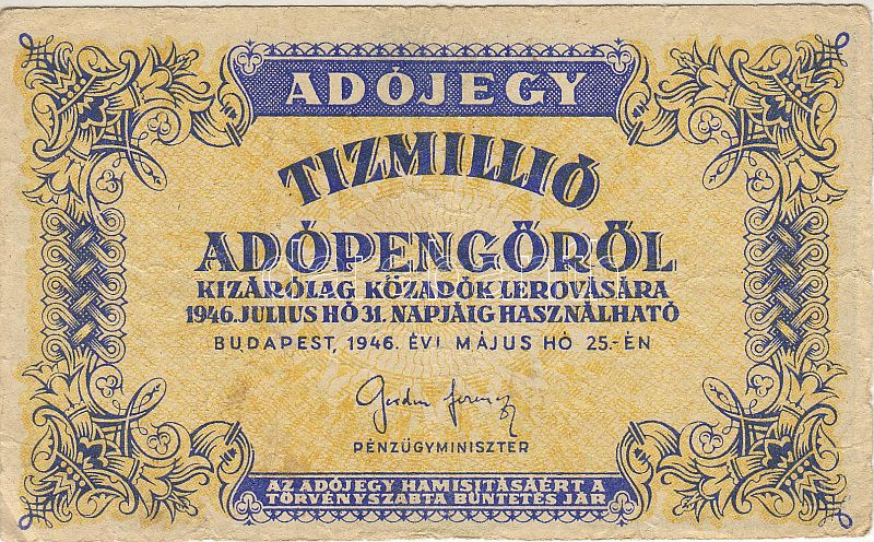 Leírás: 1946. 10.000.000Adóp. (variáns) hátlapon a címer fordított állású T:III/IV