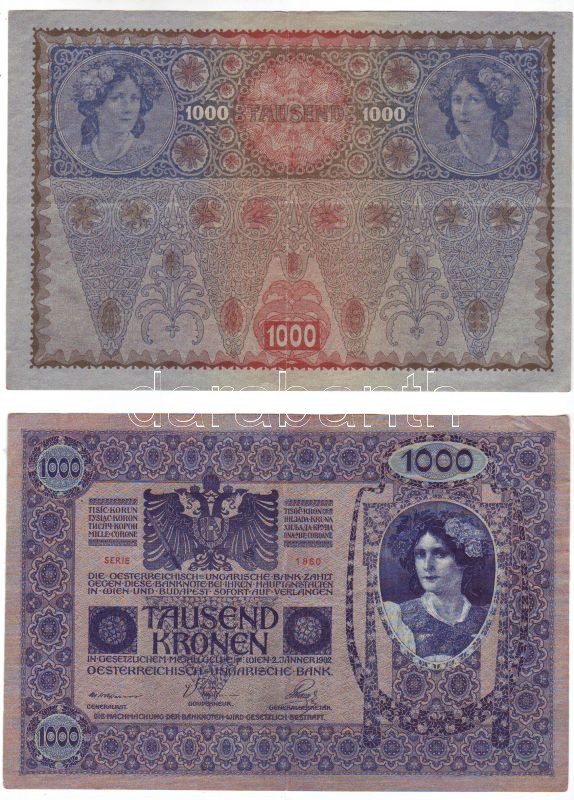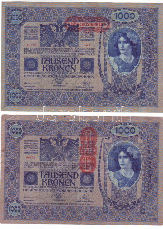 Leírás: Ausztria 1902. 1000K 2 klf típusban, 2 klf típusú piros "Deutschösterreich" fny-sal T:II Csak egyszer hajtva!