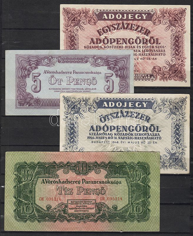Kis tétel "V.H.-infla" 1944. 5P V.H. T:II Csak egyszer hajtva!, 10P V.H. T:II, 1946. 100.000Adóp. T:II Csak egyszer hajtva!, 1946. 500.000Adóp. T:II CSak egyszer hajtva!
