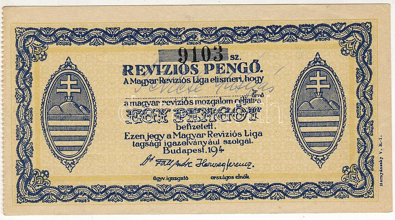 Leírás: 194.. Revíziós pengő arckép nélkül T:II