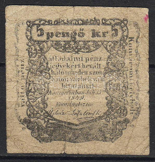 Komárom 1849. 5Kr T:II/III https://www.darabanth.com/hu/39-Gyorsarveres/39.0/Numizmatika/Papir-es-fem-szuksegpenzek-hadifogolypenzek-penzhelyettesito-bonok-fantaziapenzek~224/Komarom-1849-5Kr-TIIIII~II76446