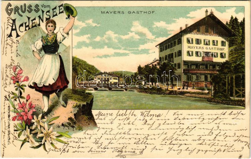 Leírás: 1899 (Vorläufer) Achensee, Mayers Gasthof / hotel and restaurant, folklore. Ottmar Zieher Art Nouveau, floral, litho