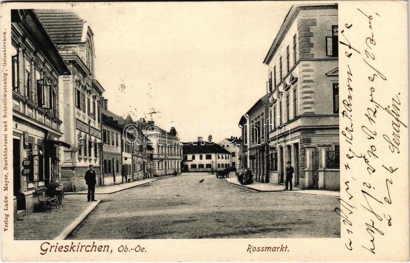 1907 Grieskirchen, Rossmarkt / street with shops https://www.darabanth.com/hu/39-Nagyaukcio/39.1/Kepeslapok/Ausztria~16055/1907-Grieskirchen-Rossmarkt-street-with-shops~II2715708
