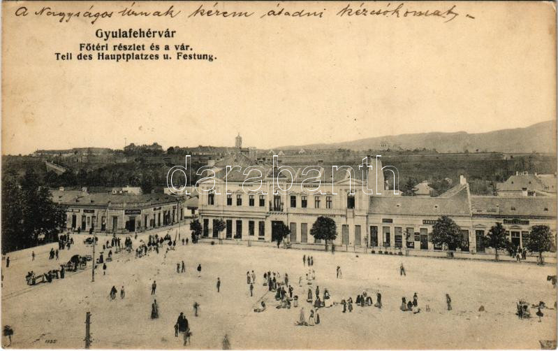 Gyulafehérvár, Alba Iulia; Fő tér, vár, piac, Sörcsarnok, Weiss Bernát, Fonciere biztosító, Fürst, Hungária szálloda, Takarékpénztár, Kovács, Adler és Herman üzlete. Petri F. Vilmos kiadása / main square, castle, market, shops, insurance company, hotel, savings bank (EK)