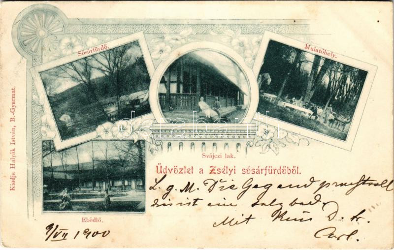 Leírás: 1900 Zsély, Zelovce; Sósár gyógyfürdő, Sósárfürdő, Svájci lak, Mulatóhely, Ebédlő. Halyák István kiadása / Sosárske Lázne / spa, bath, villa, inn, restaurant. Art Nouveau, floral (Rb)