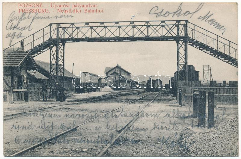 Leírás: 1914 Pozsony, Pressburg, Bratislava; Újvárosi pályaudvar, vasútállomás, gőzmozdony, vonat, felüljáró híd / Neustadter Bahnhof / railway station, locomotive, train, bridge (kis szakadás / small tear)