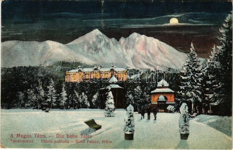 1917 Tátralomnic, Tatranská Lomnica (Magas-Tátra, Vysoké Tatry); Palota szálloda télen este / Hotel Palace at night in winter + "PODOLIN-KASSA-BUDAPEST 288." vasúti mozgóposta (EK)