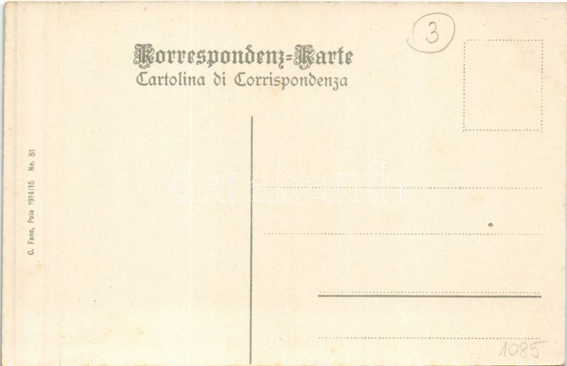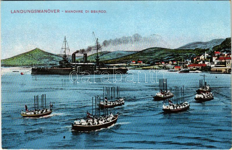K.u.K. Kriegsmarine Landungsmanöver / Manovre di sbarco / Austro-Hungarian Navy landing maneuver of SMS Kaiserin Elisabeth protected cruiser, mariners in boats, disembarkation. G. Fano, Pola 1914/15. No. 51.