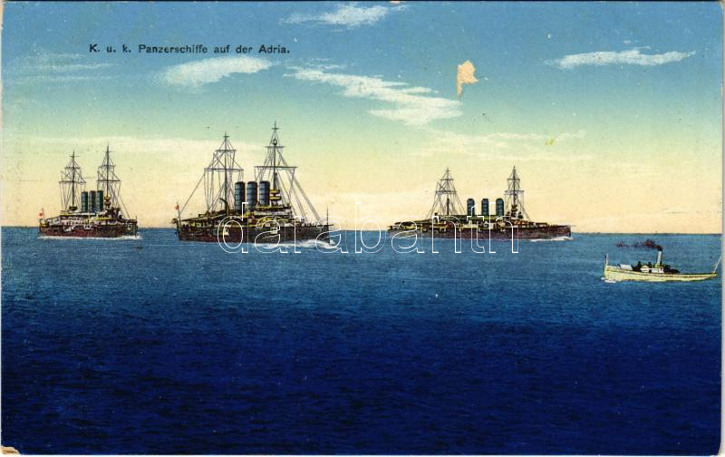 K.u.K. Kriegsmarine Panzerschiffe auf der Adria. SMS Kaiser Karl VI, SMS Erzherzog Friedrich, SMS Erzherzog Ferdinand Max. Druck v. M. Schulz. G. Costalunga, Pola 1914/15. / WWI Austro-Hungarian Navy ironclad warships / Osztrák-magyar csatahajók az Adrián