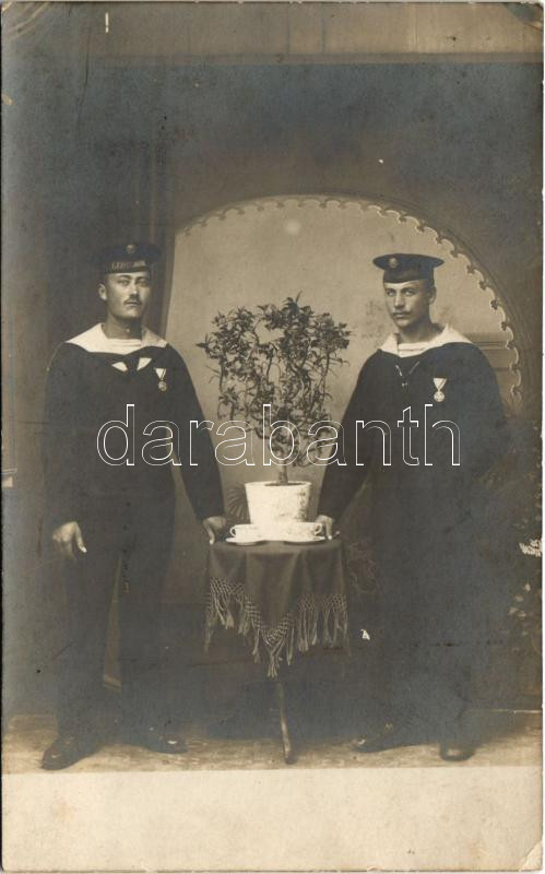 Leírás: Osztrák-magyar haditengerészet matrózai, műtermi felvétel / K.u.K. Kriegsmarine Matrosen / Austro-Hungarian Navy mariners. Studio photo (EK)