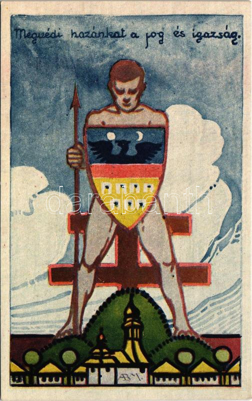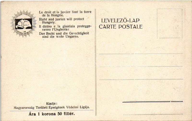 Megvédi hazánkat a jog és az igazság. Magyarország Területi Épségének Védelmi Ligája kiadása / Right and Justice will protect Hungary. Hungarian irredenta propaganda, Trianon s: A.B.M.