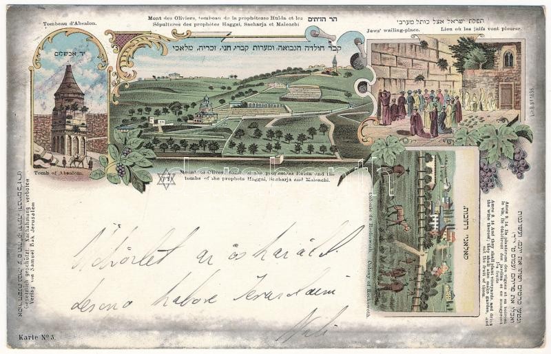 1906 Jerusalem, Tomb of Absalom, Mount of Olives, tombs of the prophetes Hulda, Haggai, Sacharja and Maleachi, Jewish wailing place, Colony of Rechowoth, Hebrew, Judaica. Samuel Bak Karte No. 3. Art Nouveau, floral, litho (EK)