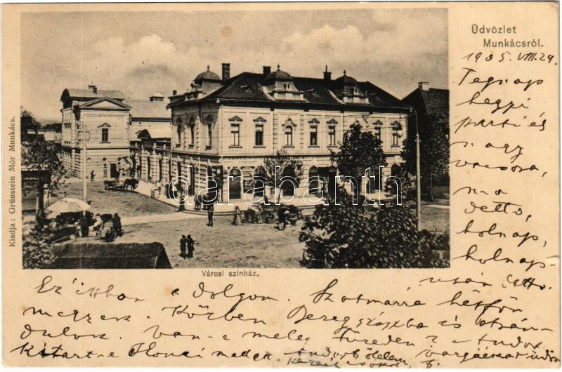 Leírás: 1905 Munkács, Mukacheve, Mukacevo; Városi színház, piac, Iczkovics József és Gottesmann üzlete. Grünstein Mór kiadása/ theatre, market, shops
