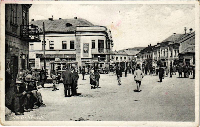 Leírás: 1939 Huszt, Chust, Khust; Fő tér, autóbuszok, Hitelbank, üzletek / námestí / main square, autobuses, credit bank, shops (EK)