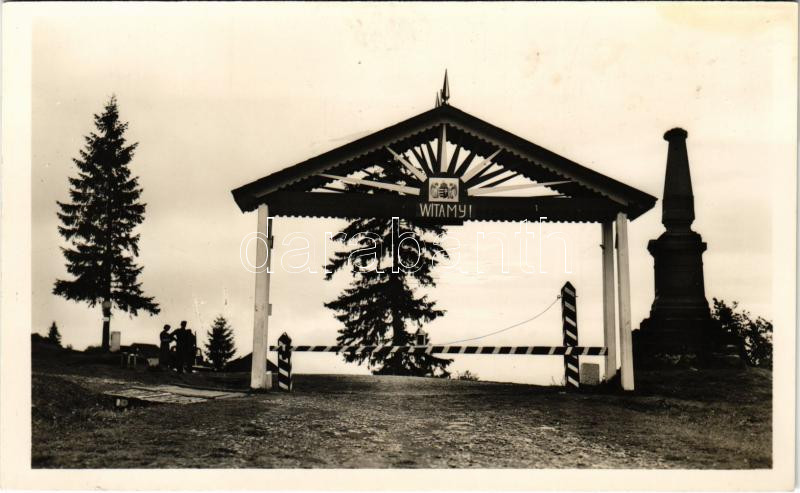 Vereckei-hágó, Veretskyy pereval, Verecke Pass, Serednioveretskyy; Az ezer éves határ Vereckénél a határkővel, magyar címer, sorompó, győzelmi kapu, emlékobeliszk / Hungarian-Polish historical border, Hungarian coat of arms, barrier, "Witamy!" ("Welcome!" in Polish), memorial obelisk