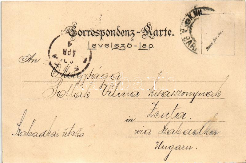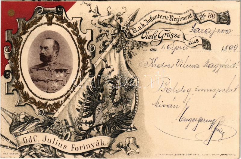 1899 (Vorläufer) Gd C. Julius Forinyák. Viele Grüsse aus K.u.k. Infanterie Regiment Nr. 86. / Forinyák Gyula császári és királyi altábornagy, titkos tanácsos, főrend. A cs. és kir. 86. Gyalogezred szecessziós üdvözlete / Austro-Hungarian military greeting, Art Nouveau lieutenant general. Senefelder Mars (Rb)