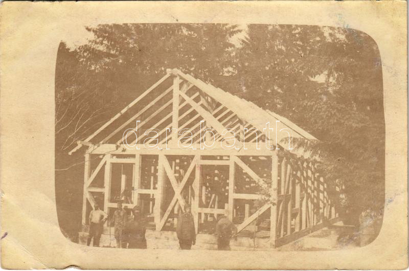 Első világháborús osztrák-magyar katonai építőcsapat egy épület alapjaival / WWI Austro-Hungarian K.u.k. military construction, soldiers building a camp. photo + "Kommando der K.u.k. Baukompagnie No. 1/62" (EB)