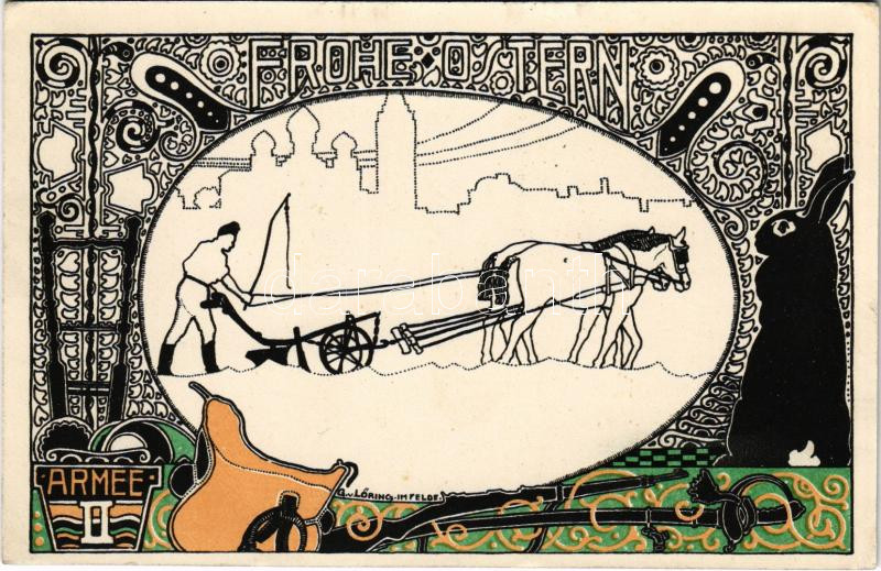 Frohe Östern im Felde. Armee II. / Első világháborús osztrák-magyar szecessziós katonai húsvéti üdvözlet 2. hadseregtől / WWI K.u.k. military Easter greeting. Athenaeum Art Nouveau s: G. v. Lőrincz