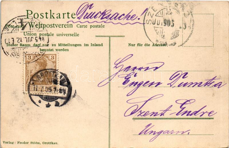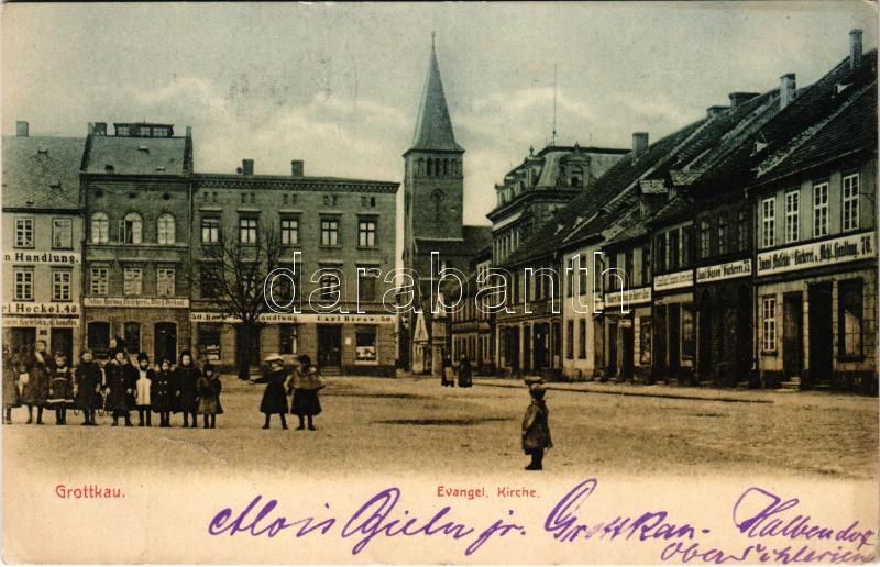 Leírás: 1905 Grodków, Grottkau; Evangel. Kirche, Bäckerei, Carl Riese 50., Heckel 48. Verlag Feodor Stöbe / church, square, shops, bakery