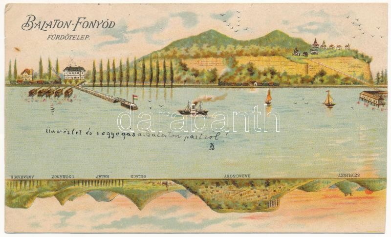 Leírás: 1899 (Vorläufer) Fonyód, Balatonfonyód; Fürdőtelep, Badacsony. Fejjel-lefelé is fordítható litho képeslap / upside-down reversible litho postcard (vágott / cut)
