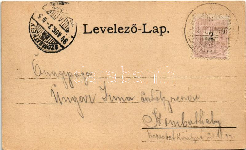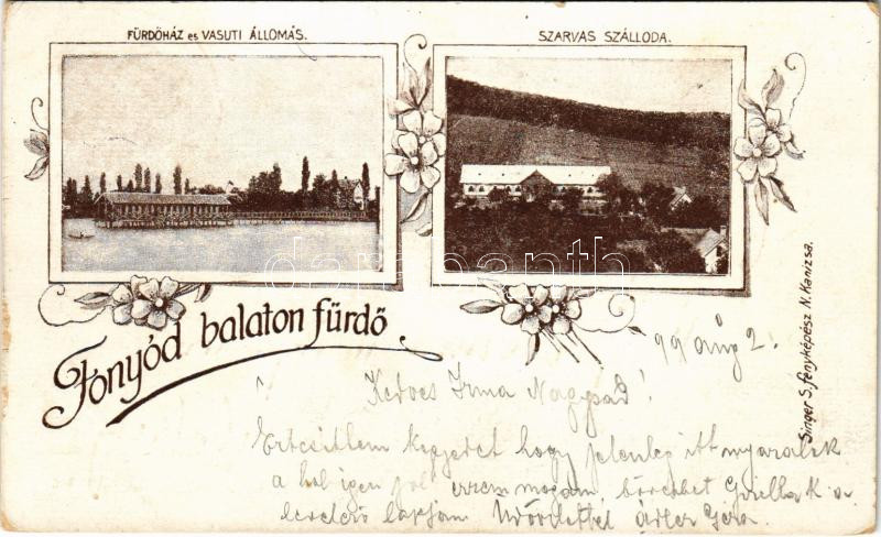 Leírás: 1899 (Vorläufer) Fonyód-Balatonfürdő, fürdőház és vasútállomás, Szarvas szálloda. Singer S. fényképész, Art Nouveau, floral