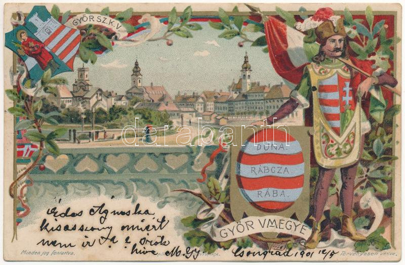 Leírás: 1901 Győr. Győr vármegye Duna-Rábca-Rába címere és magyar zászló. Athenaeum Rt. kőnyomdája, Art Nouveau, floral, litho s: Zich (r)