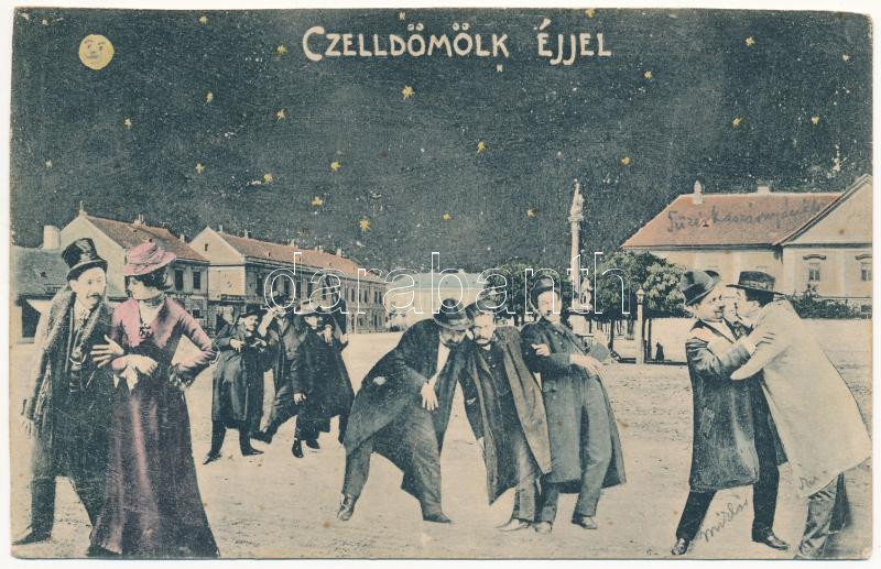 Leírás: 1908 Celldömölk. Humoros részeg montázs éjjel, Szagán János kiadása (EK)