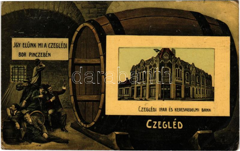 Cegléd, Ipar és kereskedelmi bank. "Így élünk mi a czeglédi bor pinczében" Részeges humoros montázslap a borospincéből. Sárik Gyula kiadása / drunk men montage (EK)