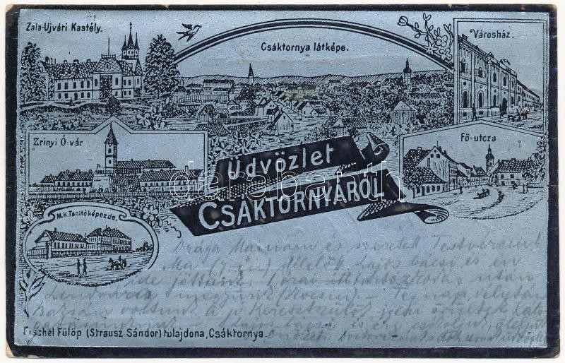 1899 (Vorläufer) Csáktornya, Cakovec; Zala-Újváry kastély, Zrínyi Ó vár, városház, Fő utca, M. kir. tanítóképezde. Fischel Fülöp (Strausz Sándor) tulajdona. Ezüst fémes hatású szecessziós képeslap / castles, town hall, main street, teachers' training institute. Silver metallic Art Nouveau, floral (ázott sarok / wet corner)