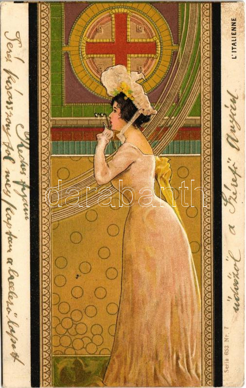 1901 L'Italienne. Serie 653. Nr. 7. / Olasz hölgy. Magyar dombornyomott szecessziós litho művészlap / The Italian lady. Hungarian Art Nouveau embossed litho s: Basch Árpád