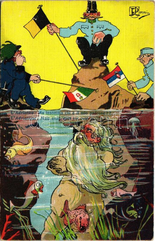 L'Adriatico: Ma insomma chi e il mio padrone?? / Első világháborús olasz katonai gúnyos propaganda: Kié az Adriai tenger? / WWI Italian anti-war military mocking propaganda: Who is the master of the Adriatic Sea? litho