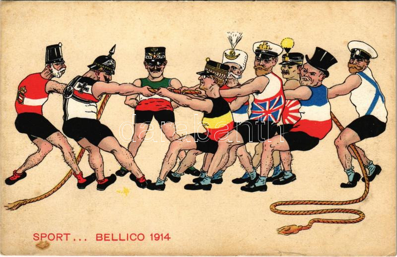 Sport... Bellico 1914 / Első világháborús olasz központi hatalmak ellenes katonai gúnyos propaganda: Központi hatalmak és antanthatalmak uralkodói / WWI Italian anti-Central Powers military mocking propaganda: Emperors of the Central Powers and Entente Powers, tug of war. C.C.M. litho