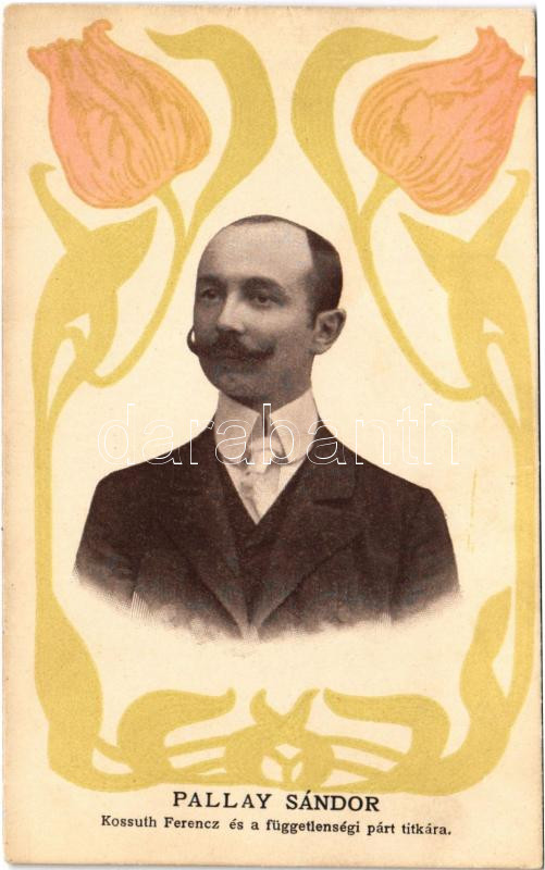 Pallay Sándor - Kossuth Ferenc és a Függetlenségi (országgyűlési függetlenségi és 48-as) párt titkára. Igaz magyar ipar, kiadja Gonda Mihály / Hungarian political party secretary. Art Nouveau, floral, litho