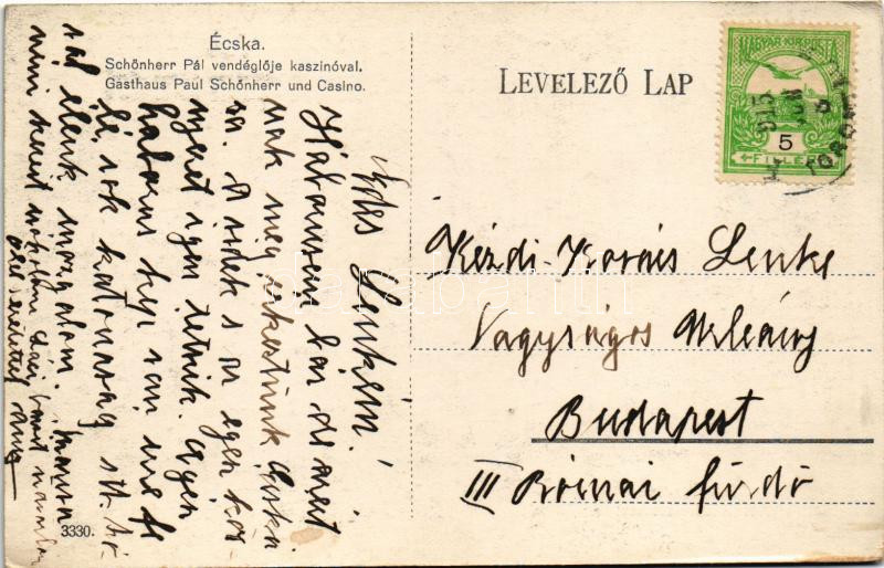 Leírás: 1915 Écska, Ecka; Schönherr Pál vendéglője a kaszinóval / Gasthaus und Casino / restaurant and casino