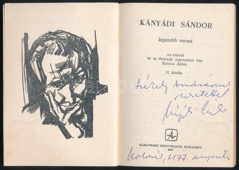 Kányádi Sándor legszebb versei. Az előszót és az életrajzi jegyzeteket írta: Katona Ádám. A szerző, Kányádi Sándor (1929-2018) által DEDIKÁLT példány. Bukarest, 1977., Albatrosz, 1 (költő arcképe, Nagy Imre munkája) t + 143+1 p. II. kiadás. Kiadói papírkötés.