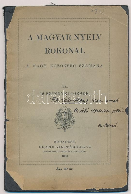 Szinnyei József: A magyar nyelv rokonai. A nagy közönség számára. A szerző, ifjabb Szinnyei József (1857-1943) nyelvész, egyetemi tanár, az ELTE Bölcsészettudományi Kar későbbii dékánjának által Lehr Albert (1844-1924) középiskolai tanár, nyelvész, esztéta, műfordító, költő, irodalomtörténész, részére DEDIKÁLT példány. Bp., 1883., Franklin, 47+1 p. Átkötött papírkötés, az utolsó lapon kis szakadással, a hátsó kissé szakadt borítót bekötötték.