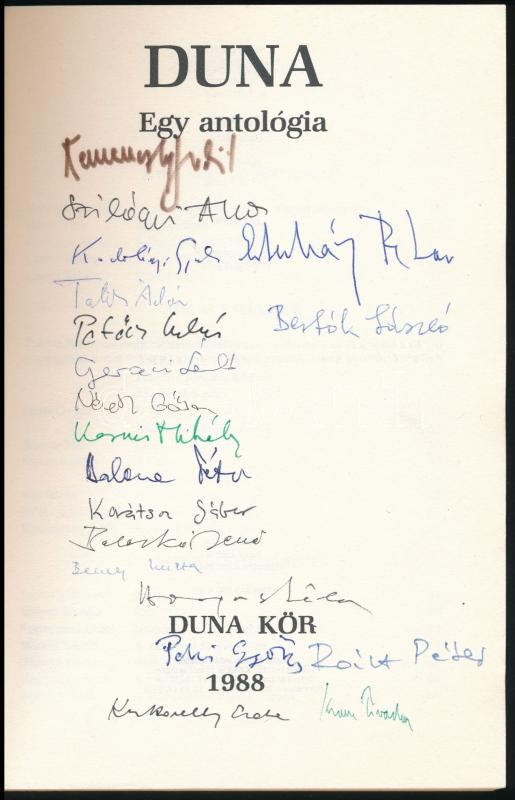 Vargha-Nagy-Perczel: Duna. Egy antológia. H.n., 1988, Duna Kör. Kiadói papír kötésben. A kötet szerzőinek autográf aláírásával: Esterházy Péter, Karátson Gábor, Kodolányi Gyula, Kornis Mihály, Petri György, stb.