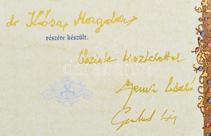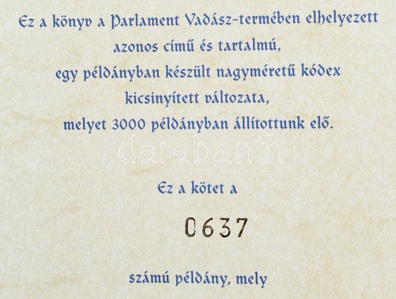 'Ez a könyv a Parlament Vadász-termében elhelyzetett azonos című és tartalmú, egy példányban készült nagyméretű kódex kicsinyített változata. Számozott (0637./3000), a szerzők, Benke László (1948-2019) és Gribek Lajos által aláírt és Kósáné Kovács Magda (1940-2020) politikus, Európai Parlament képviselő (2004-2009), egykori munkaügyi miniszter (1994-1995) részére DEDIKÁLT példány.