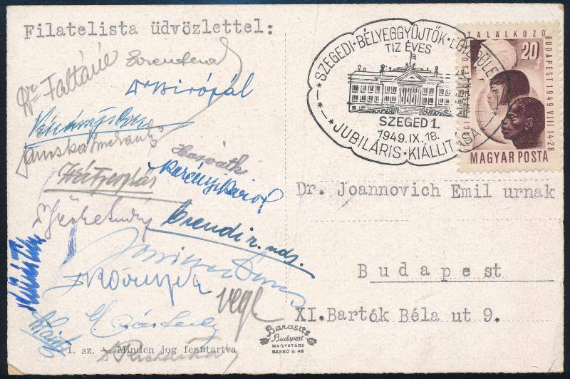 Leírás: 1949 A Szegedi Bélyeggyűjtők Egyesületének rendezvényén részt vett neves filatelisták által aláírt képeslap / autograph signed postcard