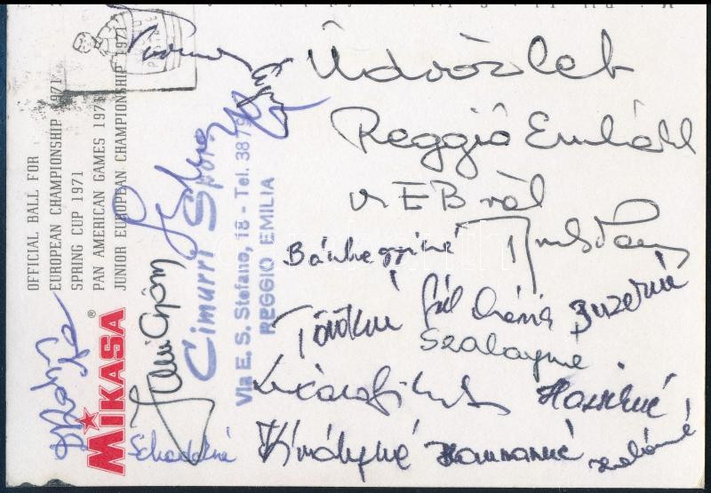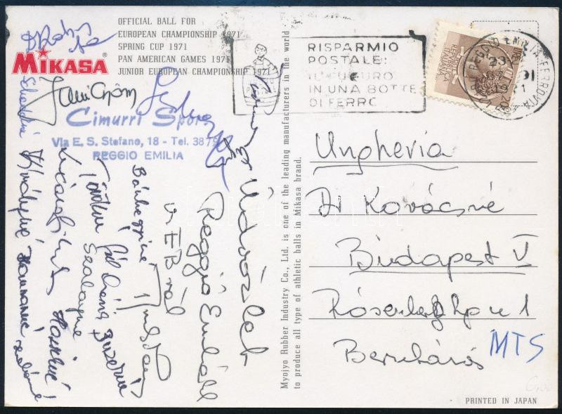 1971 Olaszországból küldött képeslap a magyar női röplabda válogatott tagjainak aláírásával Buzekyné, Szalayné, Törökné, Királyné stb. / Autograph signed postcard of the Hungarian volleyball team